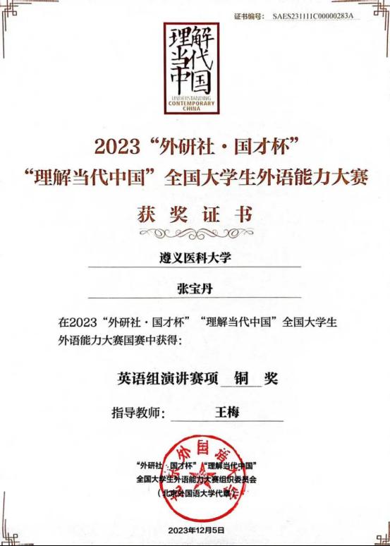 最终,凭借扎实的语言功底和出色的表现,张宝丹在全国决赛中荣获铜奖。