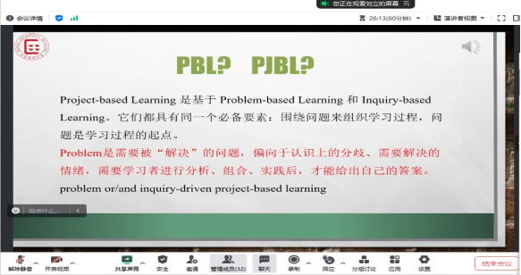 刘老师首先从“PBL”的内涵开始,对其深层次含义进行了剖析。在此基础上,再结合外语教学的特点及具体课程,阐述了PBL教学法的具体应用。随后,老师们也根据自己在PBL教学法实践中存在的问题和疑惑,与刘老师进行了更加深入的交流,刘老师也提出了更多宝贵的建议。