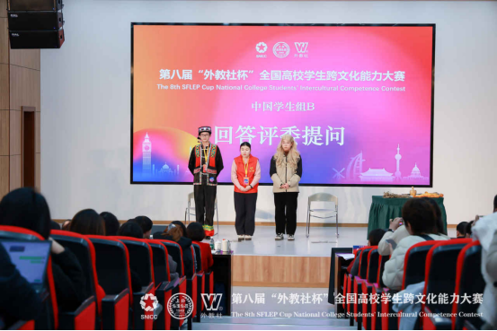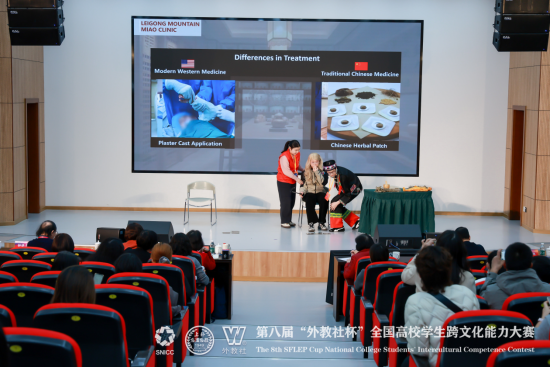 公司“Miao-tivators” 代表队由23 级临床医学专业胡湘婷、陈浩聪和23 级英语专业郑睿三位同学组成。在全国决赛的舞台上,赛事涵盖案例开发与分析、名言名句解读、知识问答等多个核心环节,考察维度全面且极具挑战性。三位同学延续省赛优势,巧妙融合医学专业知识与跨文化交际理论,以“苗寨医疗场景中的跨文化融合” 为核心展示方向,通过流利的英语表达、严谨的逻辑论证、真挚的情感传递和自信沉稳的现场应变,生动诠释了传统中医与现代西医在跨文化语境下的碰撞与共生,展现了当代医员工兼具家国情怀与全球视野的复合型人才素养,赢得了评委们的高度认可。