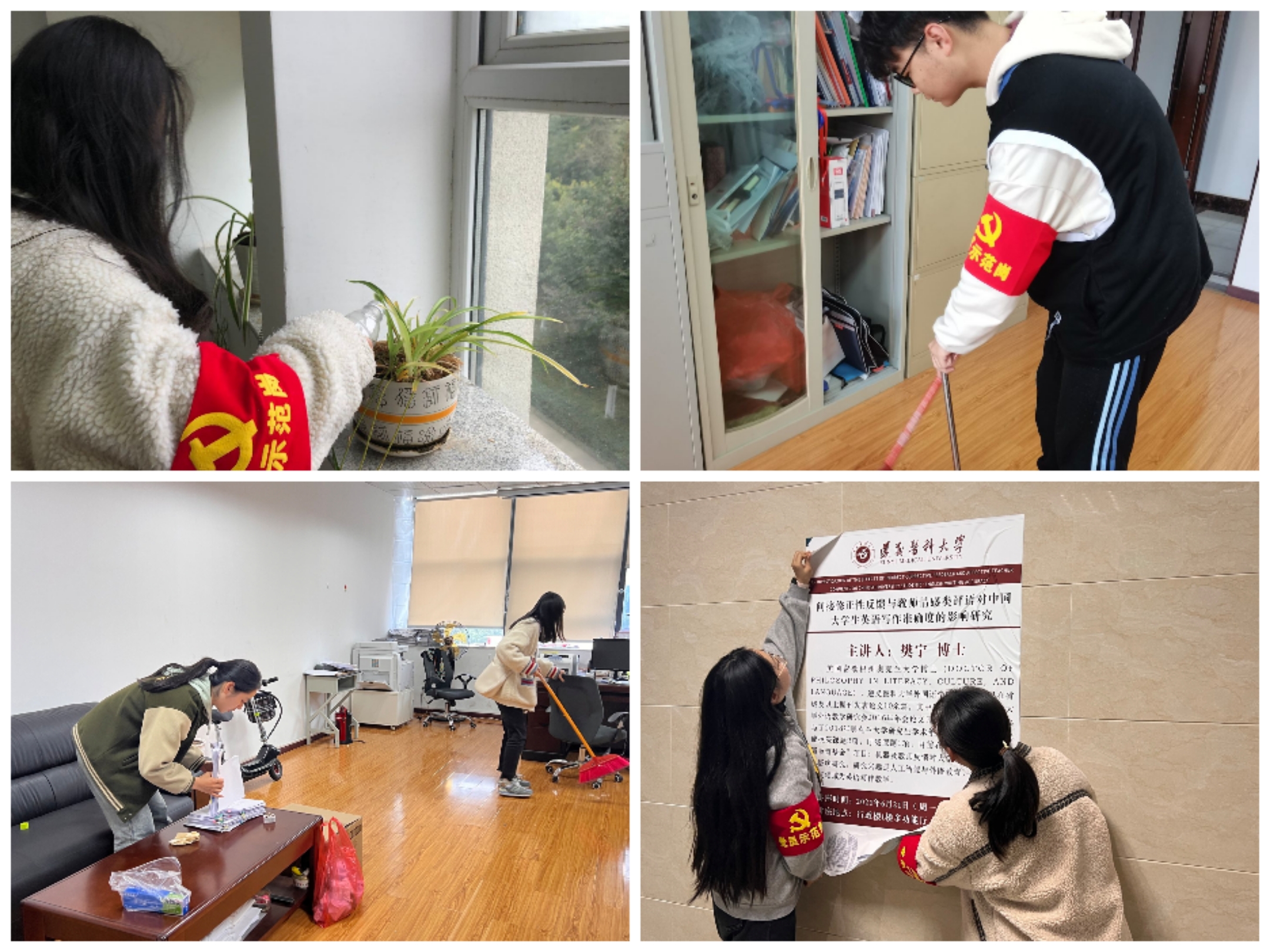 践行雷锋精神,支部同志们开展了形式多样的志愿服务活动,志在打造安全、整洁、有序、文明的校园环境,以实际行动传承雷锋精神。化身绿色先锋,开展净化校园服务。化身文明先锋,井然有序地开展校园交通引导服务。化身助理先锋,走进办公区帮助老师打扫卫生、整理资料。化身为勤劳先锋,在食堂引导员工排队就餐,主动帮助工作人员清理厨余。化身居家先锋,围绕专业教室、寝室进行卫生打扫、引导洗衣排队。支部同志用踏实地的志愿服务将雷锋精神做进校园、做进生活、做进师生心里。