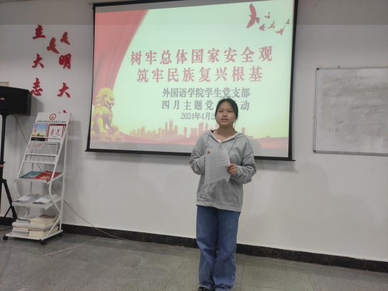 活动主要设置了国家安全观和读书分享两个环节。支部宣传委员张佳丽以“树牢总体国家安全观,筑牢民族复兴根基”为主题,带领全体成员学习了“2024总体国家安全观宣传手册”,以及总体国家安全观相关知识,引导党支部成员树立国家安全意识,自觉关心、维护国家安全。项飘、陈美艳、武桂花三名入党积极分子分享了总体国家安全观的学习体会。为营造读好书、善读书的优良氛围,从阅读中汲取力量,预备党员陆廷慧、张清清分别就自己阅读的书籍《目送》《我与地坛》向大家进行了解读、分享,营造了积极学习、乐于分享的良好氛围,助力提高文化素养。