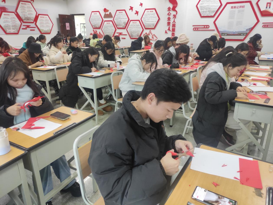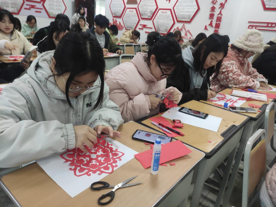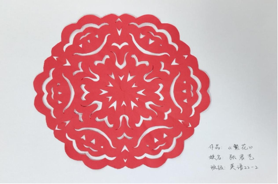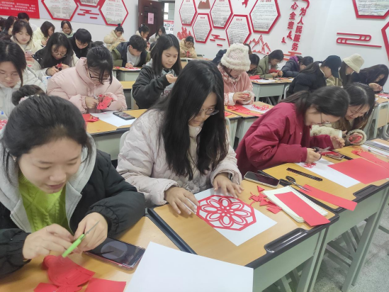 巧手剪纸,喜迎新年。活动前,同志们积极寻找学习视频,提前练习学习。活动中,大家充分发挥想象力与创新力,聚精会神地尝试着、琢磨着,折、画、勾、裁仔细设计,随着剪刀的一开一合,不大会儿功夫一张张普通的红纸就演变成了各式各样精致灵动、喜庆活泼的剪纸作品,“莺歌蝶舞”“繁花”“新年快乐”等各式图案精彩呈现。支部全体成员们在一纸一剪中把家国情怀融入到中国传统技艺中,体现了成员们思想意识的“红”,创作内容的“活”和学习氛围的“浓”。