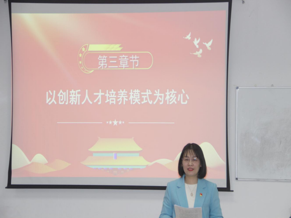 唐茜从以科技创新重大需求为牵引、以优化高校学科设置为抓手两个方面展开讲解。她强调,世界科技强国竞争,核心比拼的是国家战略科技力量,国际形势发生深刻复杂的变化,作为青年人,同学们应该树立远大理想、热爱伟大祖国、担当时代责任、勇于砥砺奋斗、练就过硬本领、锤炼品德修为,为开创人类社会更加美好的未来作出新的更大贡献。杨芳从以创新人才培养模式为核心、以融汇全球智慧资源为路径两方面展开阐述。结合外语专业人才培养情况,她分析了目前的就业形势,希望同学们能够融会贯通,有家国情怀、有全球视野、有专业本领;因地制宜制定就业目标,在学习、实践中增长才干、练就本领,以真才实学服务人民,以创新创造贡献外语人才力量。