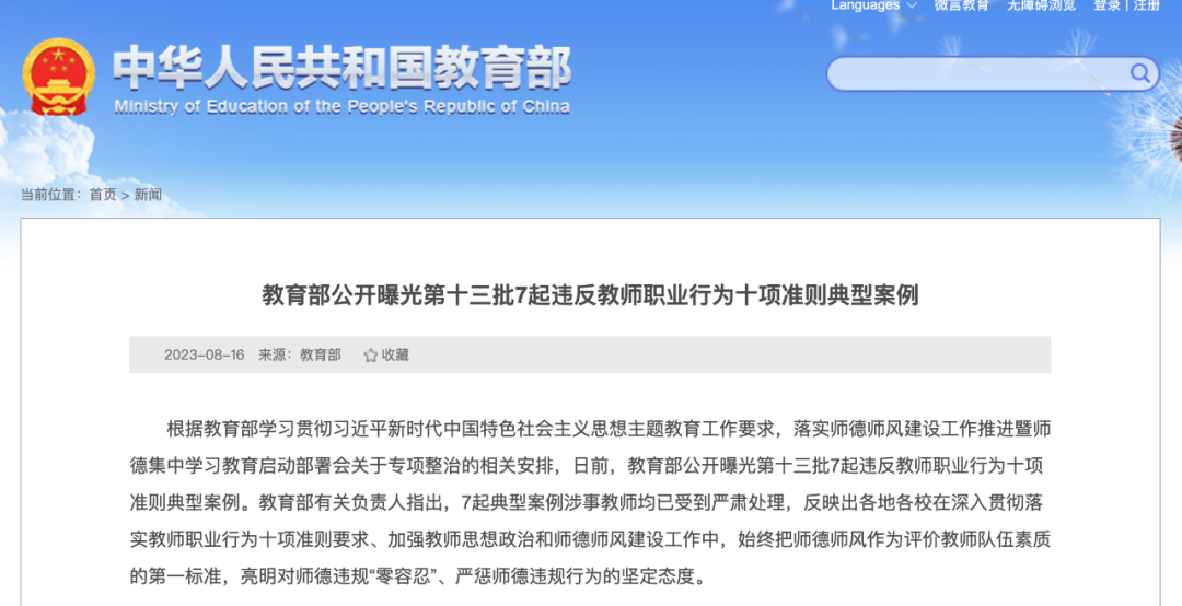 8月16日,教育部网站曝光第十三批7起违反教师职业行为十项准则典型案例。其中包括2起高校教师涉事案例,涉及教师违规获取津贴、不雅行为等问题。