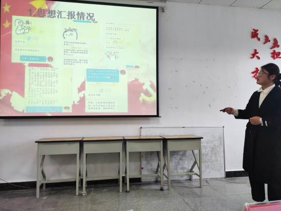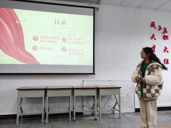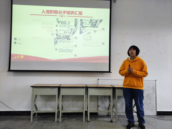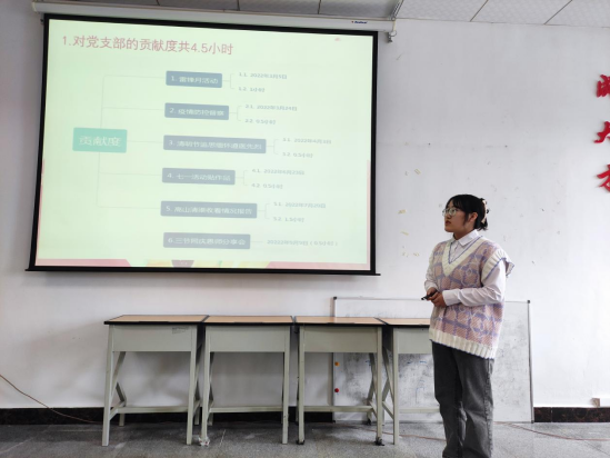 入党积极分子主要围绕思想汇报情况(思想汇报主动性、思想汇报次数、思想汇报内容、思想汇报质量)、学习强国积分、支部活动与贡献度时数、社会实践与志愿服务、员工干部工作、获奖情况等方面通过PPT进行汇报,本次汇报成绩是入党积极分子能否进入下一阶段考察的重要依据之一。党支部书记对汇报进行了总结,她向同志们强调要树立正确的入党动机,不仅要从思想上入党,更要从行动上入党,“先上岗,后入党”。