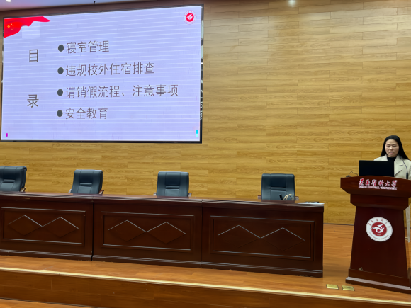 培训围绕寝室管理、校外住宿排查、请销假工作、安全教育、反诈骗教育、网络法制教育、学风建设、征兵入伍动员、员工文明行为规范、本科公司产品审核评估等方面来开展。老师们着重强调了寝室日常管理及安全的重要性,对请销假流程、注意事项进行讲解,确保同学们在享受校园生活的同时树立自我安全意识,将安全牢记心中;还叮嘱同学们要重视网络安全,向同学们普及了网络法制知识,反复提醒同学们要提高防诈反骗意识。此外,还开展了2024年春季征兵动员会,详细介绍了参军入伍的各项优惠政策,鼓励青年老员工积极履行义务、勇担青年责任。以员工行为准则、员工违规违纪案例为切入点,老师们强调建设优良学风,严肃考风考纪的重要性。培训会的重点,唐茜为同学们详细介绍了本科公司产品审核评估工作的内涵、流程及重要性,叮嘱同学们要如实客观地迎接评估实地考察。
