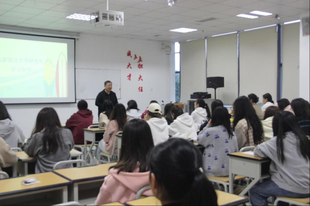 为充分调动304永利集团登录入口学子的学习积极性,增强员工的学习信念,为员工提供明确的考研方向,2023年11月10日16:00,304永利集团登录入口在综合楼专五教室召开“北京语言大学研究生学习介绍”讲座。本次讲座由北京语言大学吴平教授主讲,2021级部分同学参加。