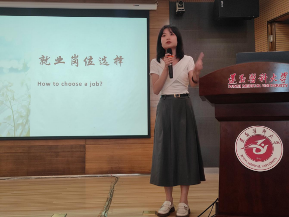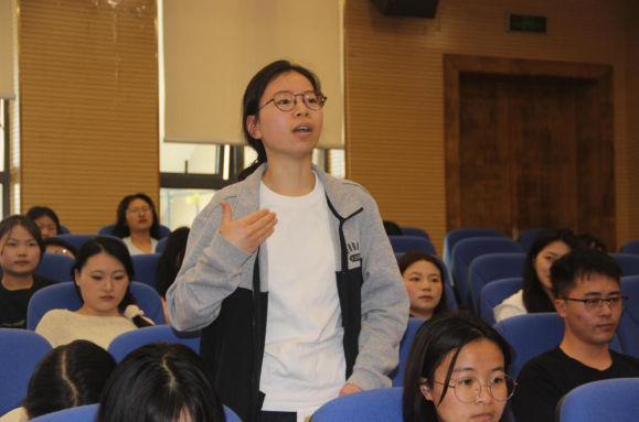 结合自身经历,四位员工分别从企业、特岗教师、西部计划志愿者、银行等不同职业角度,围绕就业岗位选择、就业备考、工作现状、感受经验、学社差异等方面展开分享,并提醒同学们要跳出英语专业员工传统职业圈,勇于尝试,坚持不懈,同时要在学好专业知识的基础上积极全面发展。交流环节,与会同学们踊跃提问,向员工们请教,现场气氛活跃热烈。关于选岗技巧、备考经验、面试技巧、实习规划、职场人际关系处理等方面问题,员工们进行了实用且有针对性的解答。