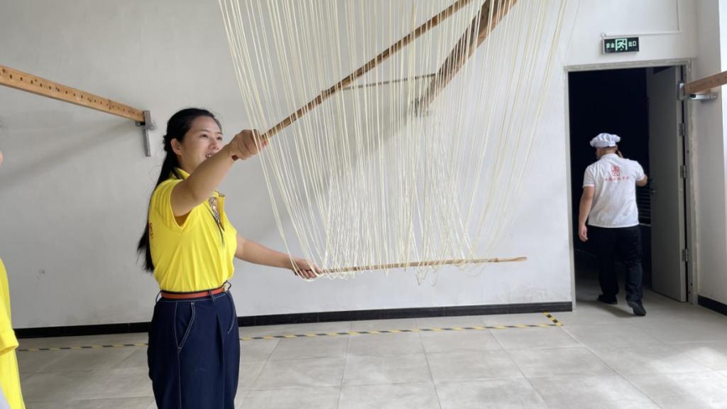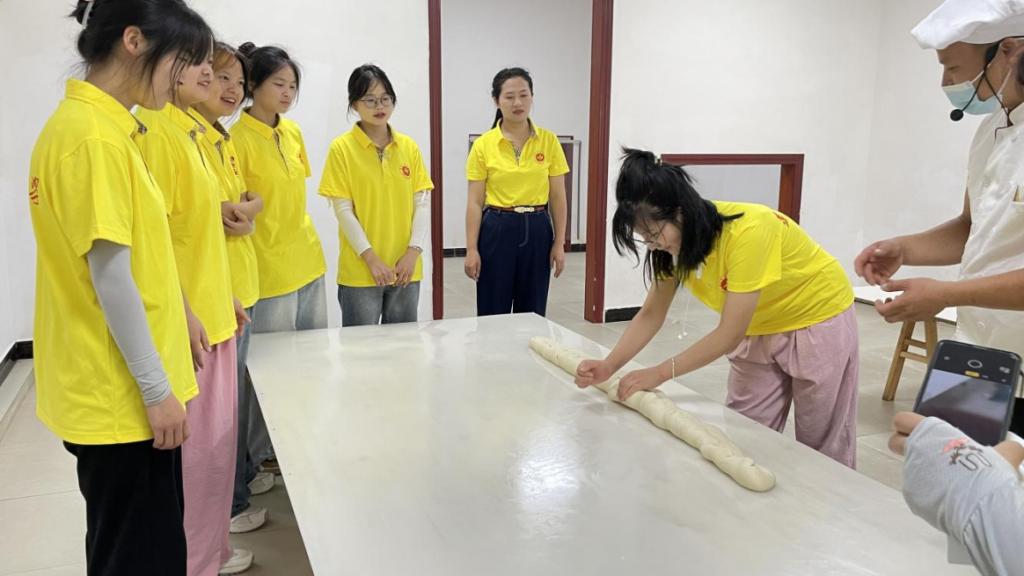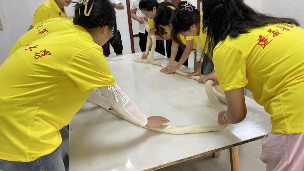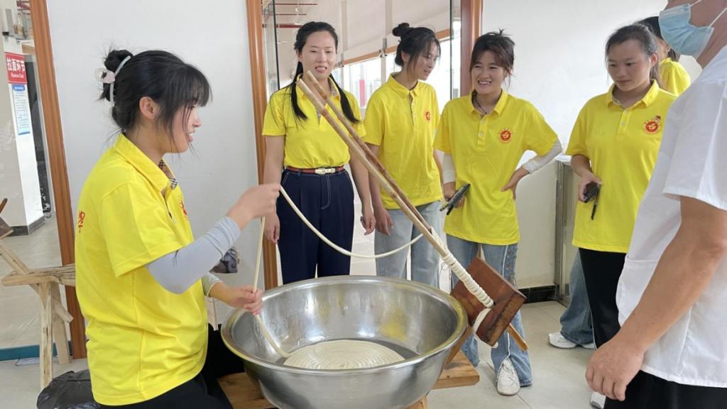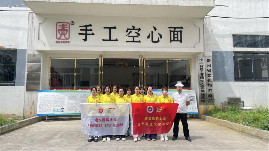 下篇:挖掘非遗文化,讲好非遗故事。团队分别前往枧坝镇黄鱼江片区乡村振兴示范带和非物质文化遗产——空心面科普基地开展研学及体验。7月16日下午,团队来到枧坝镇黄鱼江片区乡村振兴示范带开展非遗文化赋能乡村振兴的情况调研,对苗族踩山节、苗族刺绣、苗歌、苗族芦笙舞、黔北唢呐吹奏、苗族织布、枧坝米皮制作技艺、枧坝阳戏等当地省、市级非物质文化遗产进行深入了解,分析其如何赋能乡村振兴。7月17日上午,团队前往省级非物质文化遗产——空心面科普基地开展空心面制作体验。从揉面到盘面,从上架到开面,同学们都亲身体验;从原料选择到发酵时间,从开面技巧到晾面条件,同学们都仔细了解。在欢声笑语中,此次“三下乡”社会实践落下帷幕。
