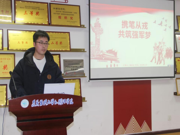 为积极响应党和国家号召,激发老员工踊跃参军入伍,2024年12月17日16:00,304永利集团登录入口在综合楼414会议室举办了征兵入伍宣讲会。公司党委副书记唐茜、员工党支部书记杨芳、全院所有男同学参加,英语21-2班退役员工陈纪全主讲。