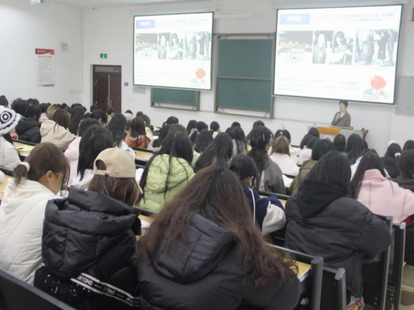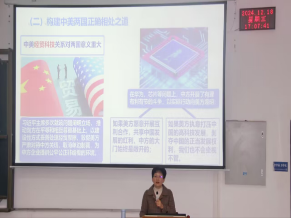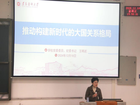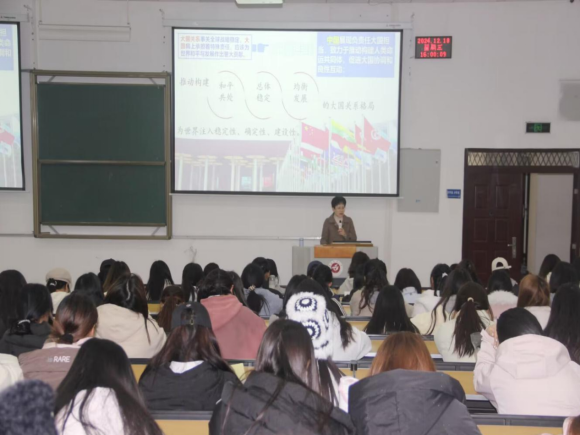 围绕着“百年变局下国际格局深刻调整”“动荡的世界呼唤大国协调合作”“责任与担当大国尤其要作表率”“中国的实践构建大国关系格局”四个方面,王明述系统阐述了当今世界大国关系。在面对世界动荡、全球治理、热点问题、经济状况时,中国坚持和平外交,促进合作交流,不断推动中俄、中美、中欧等大国之间的关系行稳致远。她详细讲述了大国竞争博弈加剧,为国家带来的危机和影响,强调拥有稳定的国际秩序和构建良好的国际格局的重要性。她还叮嘱同学们在新时代的背景下,应坚定信念、潜心求学、练就本领、崇德向善、遵纪守法,主动担负起民族复兴大任。