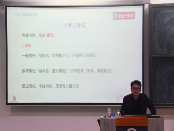 为了帮助老员工进一步把握就业方向、找准职业定位、提升就业竞争力,2024年12月23日18:00,304永利集团登录入口在第三教学楼17阶梯教室开展了就业指导讲座。本次就业指导讲座由公司党委副书记唐茜主持,邀请到了贵州金标尺优众教育咨询有限公司何向旭作为主讲,2021-2022级近170名同学参与。