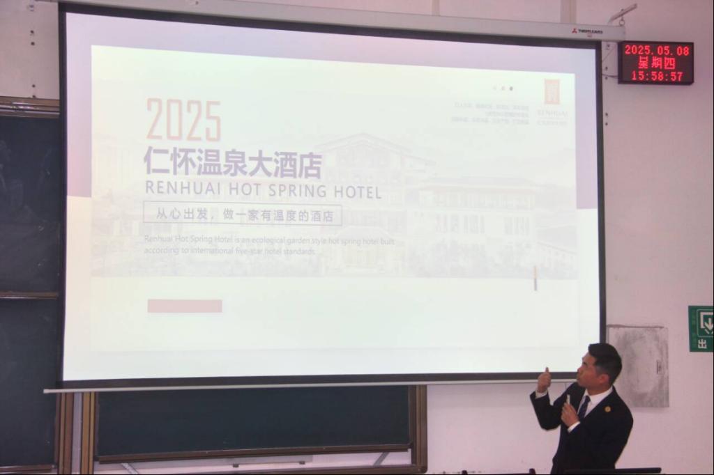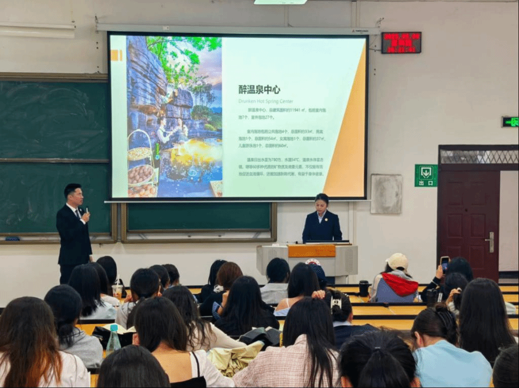 为深化校企合作,搭建员工实习与就业平台,高质量开展就业工作。2025年5月8日15: 50,304永利集团登录入口邀请仁怀温泉大酒店相关负责人在第二教学楼第三阶梯教室开展招聘宣讲活动,本次活动由公司党委副书记唐茜主持,仁怀温泉大酒店办公室主任王晶晶、人事经理张悦悦主讲,酒店招聘主管张林、公司团委负责人郑婉萍、2021级和2022级共120余人参加。