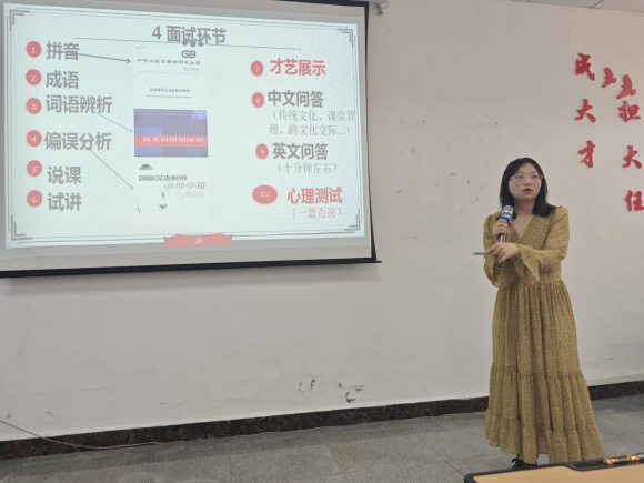 分享会上,吴连果围绕“报考条件、选国家、报名、面试、津贴”展开分享。结合政策案例,她解读报考的学历、专业、语言等要求,分析不同国家项目特点,指导同学依优势选服务国,梳理报名节点与材料准备要点。针对核心面试,她借PPT拆解拼音、成语、词语辨析等十大考核模块,结合案例讲技巧,涵盖偏误分析、说课试讲方法,汇集才艺、问答的应对思路,让同学们清晰地了解考核内容。互动环节,同学们踊跃提问,吴连果耐心细心逐一回复,鼓励同学们可以大胆尝试,提前准备。