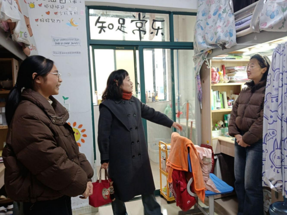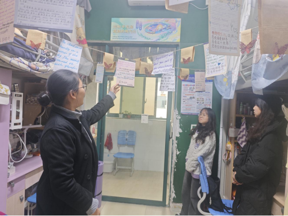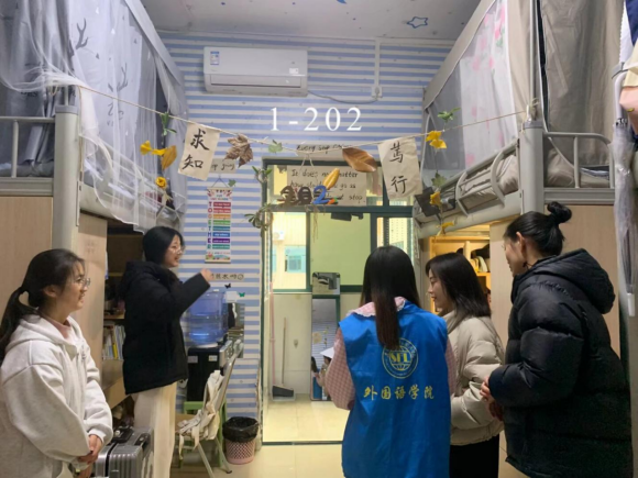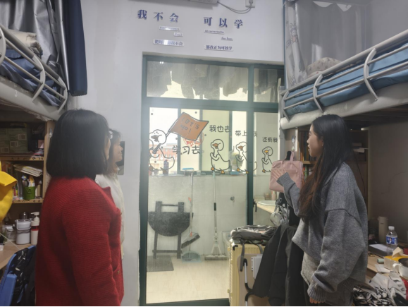活动筹备阶段便收获同学们的热烈响应,各寝室成员群策群力、发挥创意,将寝室打造成兼具个性与内涵的专属空间。18日,党委副书记、专职辅导员、教师兼职班主任与员工会干部走进每间寝室,既感受到同学们用心营造的温馨氛围,也细致核查了卫生状况与用电安全。有的寝室贴满室友的学习生活照片与各类获奖证书、过级证书,定格成长瞬间、彰显奋进风采;有的精心设置阅读角,整齐摆放中外名著,书桌张贴励志话语与个人学习计划,让学习氛围浸润日常;还有的围绕二十届四中全会精神、“十四五”成就等时代主题布置手写双语金句,将家国情怀融入生活场景,展现当代青年的责任担当。多数寝室干净整洁、秩序井然,但个别寝室存在未使用电器仍插电、乱拉电线等安全隐患,带队老师当即提醒并指导同学们现场整改,筑牢校园安全防线。经过公平公正的评选,活动最终决出一等奖1名、二等奖2名、三等奖3名及优秀奖4名。
