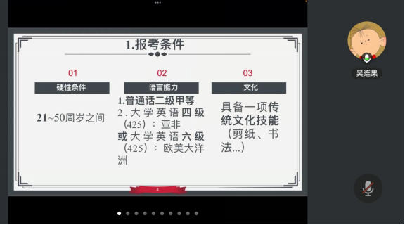 分享会上,吴连果围绕国际汉办志愿者项目展开分享,从报名条件、面试备考、岗位选择、培训派遣等方面详解项目申报核心要点,明确报名的语言能力硬性要求,建议员工结合自身情况优先选择热门志愿国家。同时,她介绍了项目薪酬体系与相关政策优惠,分享了在柬埔寨志愿者的工作安排、生活体验以及安全保障,让同学们全方位地了解到国际中文志愿者的真实情况。