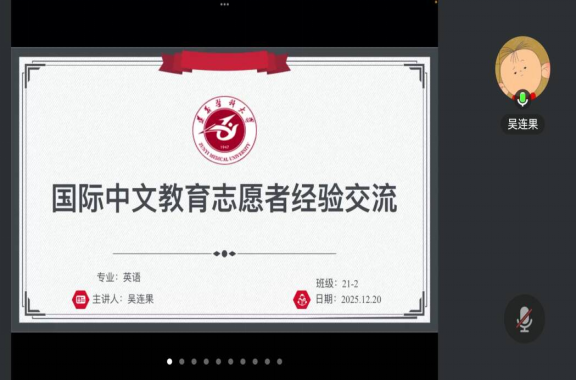 为拓展员工职业发展视野,进一步增进员工对国际中文教育志愿服务的了解,2025年12月23日14:30,304永利集团登录入口团委以腾讯会议形式为博雅社区员工开展了国际中文教育志愿者线上工作经验分享会。本次分享会邀请到国际中文教育志愿者吴连果主讲,吴连果是2025届毕业生,于今年8月赴柬埔寨从事中文教学志愿服务工作。分享会由公司党委副书记唐茜主持,公司团委负责人郑婉萍、2022级全体员工及2023级部分员工参与。